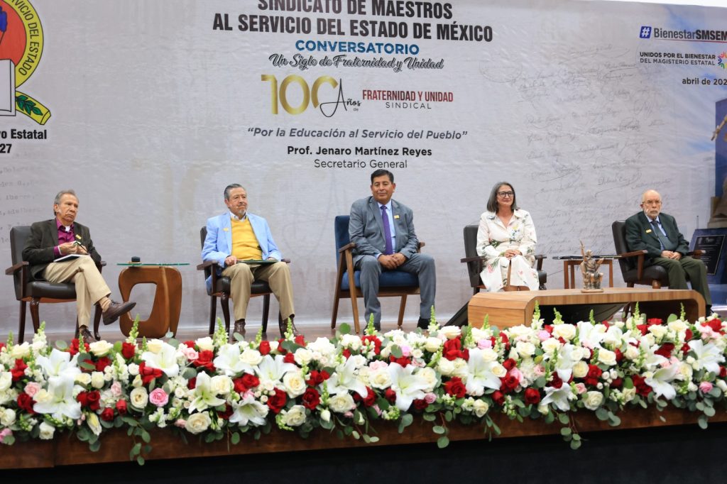 También se llevó a cabo el conversatorio “Un Siglo de Fraternidad y Unidad”, en el que participaron exsecretarios generales y docentes con trayectoria sindical, quienes compartieron experiencias y reflexiones sobre distintos momentos de la vida gremial. Durante este encuentro, Martínez Reyes reconoció la participación de los panelistas, a quienes entregó un distintivo por su aportación a la historia del sindicato.