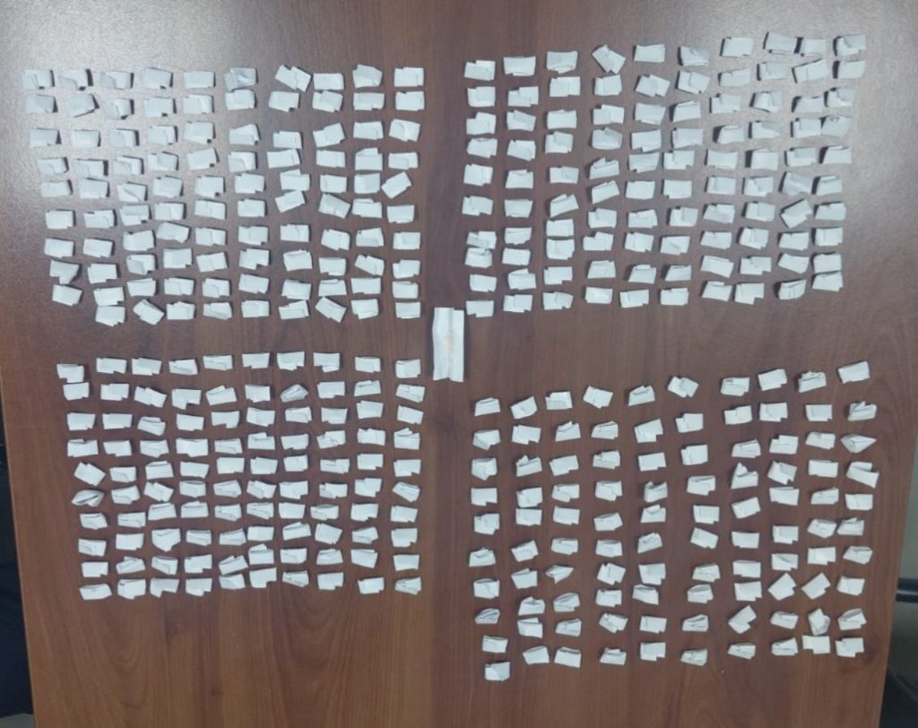 Luego de consultar la información con el Centro de Mando la unidad no contaba con reporte de robo; sin embargo, el realizar una revisión preventiva encontraron en la bolsa derecha de la chamarra de uno de los individuos 400 dosis de papel que almacenaban una sustancia granulada con características de la cocaína en piedra.