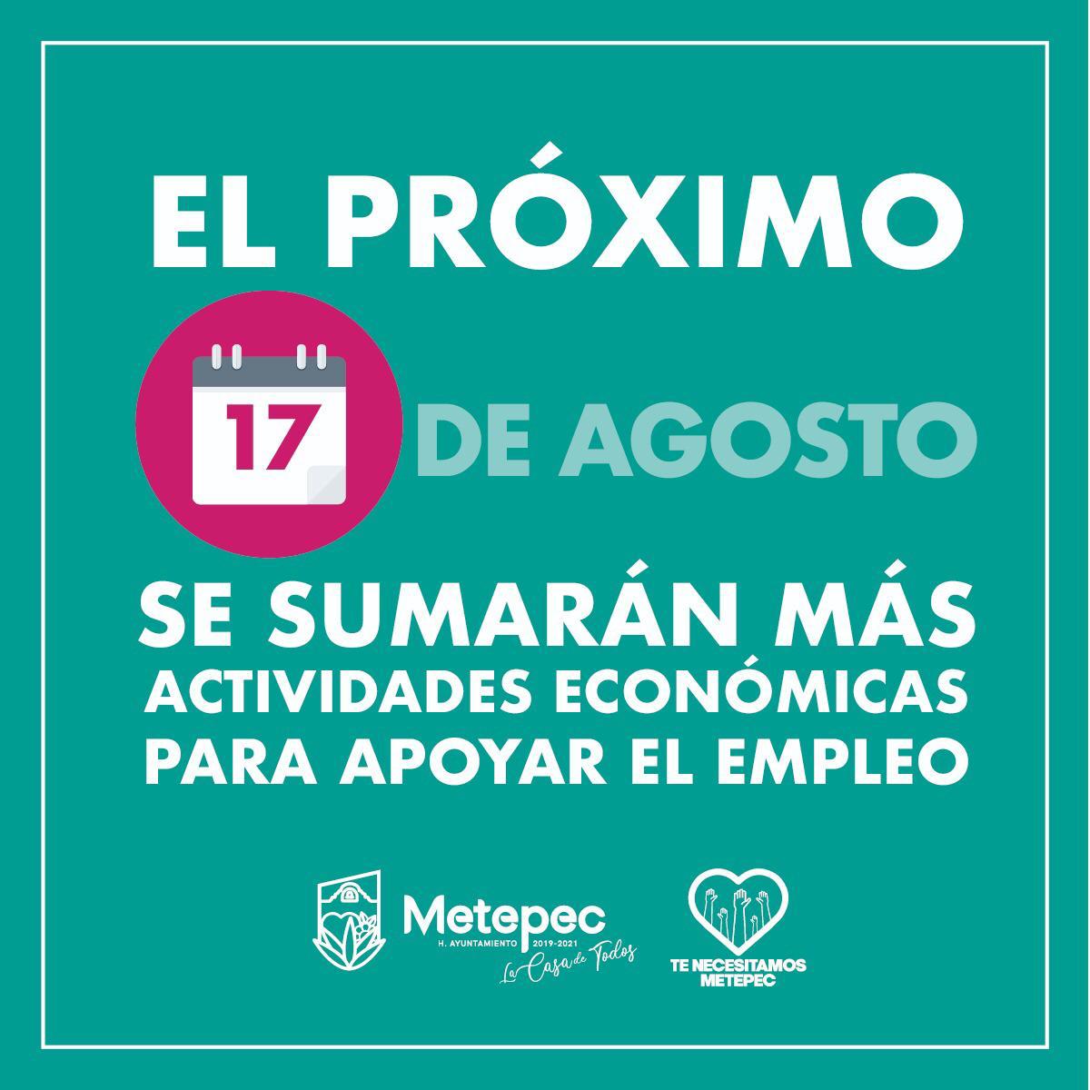 A partir de la siguiente semana, algunas actividades culturales, recreativas y deportivas en Metepec, estarán regresando con estrictas medidas de sanidad para garantizar que en el proceso de apertura escalonada se cumplan con las recomendaciones de salud para los trabajadores, proveedores, clientes y/o usuarios.