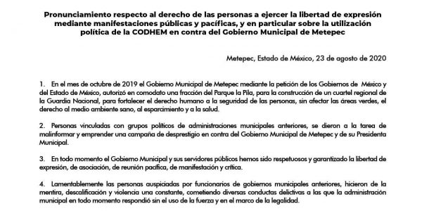 Metepec, México. 24 de agosto de 2020Por La Redacción El gobierno de Metepec se pronunció ante el posicionamiento político que hiciera este domingo la Comisión de Derechos Humanos del Estado de México (CODHEM), en torno al derecho de las personas…
