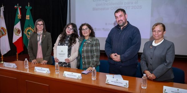 • La rectora de la UAEMéx, Martha Patricia Zarza Delgado, y el director general del Consejo Mexiquense de Ciencia y Tecnología, Víctor Daniel Ávila Akerberg, entregaron, de manera simbólica, 10 de 336 tarjetas de la Beca Ciencia con Incidencia para el Bienestar 2025.